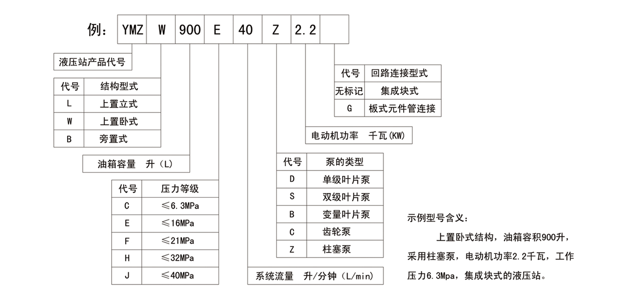 YMZ系列液壓站可用由代號(hào)組成的型號(hào)表示。編制型號(hào)時(shí),請(qǐng)選擇代表您所需要特征的代號(hào),并把它們按下例所示順序列出。如所選擇參數(shù)超出給定范圍,請(qǐng)與我公司技術(shù)部門聯(lián)系。 |